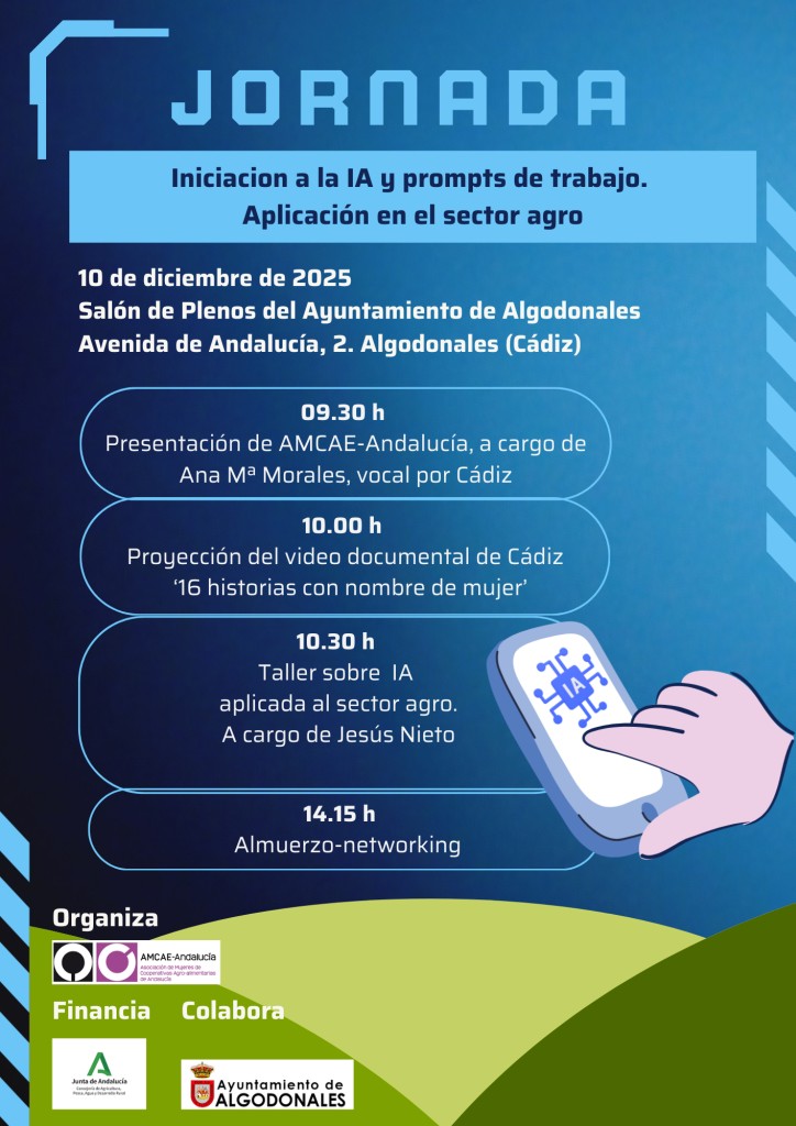 El próximo 10 de diciembre de 2025 se celebrará en Algodonales (Cádiz) la jornada “Iniciación a la IA y prompts de trabajo. Aplicación en el sector agro”, un encuentro formativo dirigido a mujeres cooperativistas y profesionales del sector agroalimentario interesadas en conocer las posibilidades que ofrece la inteligencia artificial en la mejora de procesos, la gestión de datos y las tareas habituales de las explotaciones agrarias.